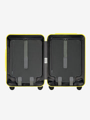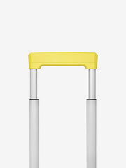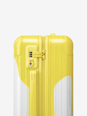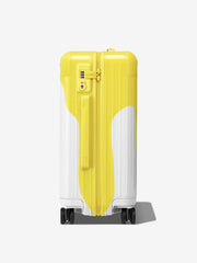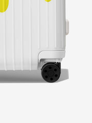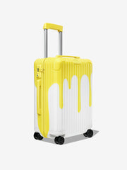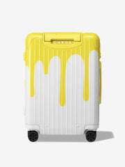 As a part of our collaboration with Rimowa, we are proud to introduce this white cabin suitcase with distinctive yellow paint drip graphics along the top. This strong, durable, and lightweight cabin suitcase is designed to fit in most airline overhead compartments and the ideal travel tool for purposeful travellers. Perfect for 2-3 days of travel.